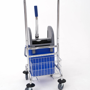 Тележка оснащена вертикальным механическим отжимом, который подходит для тряпок/швабр, плоских и верёвочных мопов, включая «кентукки», и рассчитан на многократные циклы нажатия. Стальные поворотные колёса с резиновыми протекторами и пластиковыми бамперами защищают пол и стены от царапин и позволяют легко проходить пороги, провода и небольшие выступы. Съёмная металлическая сетка-корзинка помогает держать под рукой расходники и средства уборки, сокращая лишние перемещения персонала.